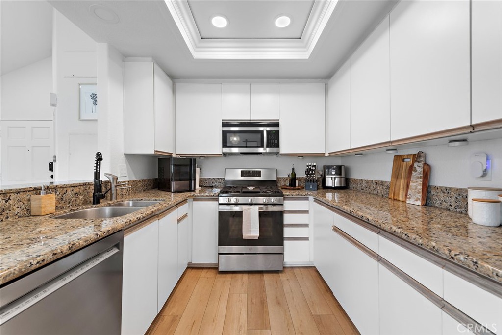 Highly desirable floor plan, upstairs end unit with two primary bedrooms! The property is ideally located in the middle of the Seagate Colony and is move-in ready. Both primary bedrooms have vaulted ceilings, walk-in closets and remodeled tub/showers. Additional upgrades include dual panned windows, nest thermostat, beautiful GE stainless steel range, New AC unit, granite countertops in the kitchen and upgraded luxury vinyl floors. Can lights have been integrated throughout the home for ease and beautiful lighting during the evening. The kitchen and breakfast bar open to the living room with a cozy fireplace. Some notable features are an indoor laundry room, epoxied garage and an open floor plan from the moment you walk-in. Soak up the southern California sun on the patio overlooking a lush green garden with plenty of room for a BBQ and furniture. The Seagate Colony is located in the award winning Laguna Unified School District and offers resort-like amenities including two swimming pools, two spas, clubhouse, newly renovated gym. HOA includes roof and pest maintenance, water and trash. One car garage and one assigned parking spot within close proximity. Conveniently located near the 73 toll road, 5 fwy, 405 fwy, and several shopping centers. Here is your opportunity to live near Orange County's most beautiful scenic hiking and biking trails and just a few miles from stunning Laguna Beach! Welcome to 112 Cinnamon Teal!