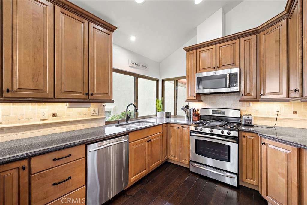 The main entry level welcomes you with an upgraded kitchen and dining area, showcasing granite countertops, travertine tile backsplash, soft-close cabinetry, pantry storage, stainless steel appliances, recessed lighting, and upgraded fixtures. Just a few steps down, the spacious living room offers cathedral ceilings, a cozy fireplace, surround sound wiring, and sliding door access to a private deck overlooking a tranquil greenbelt--perfect for relaxing or entertaining. Dual-pane windows throughout enhance comfort and energy efficiency.