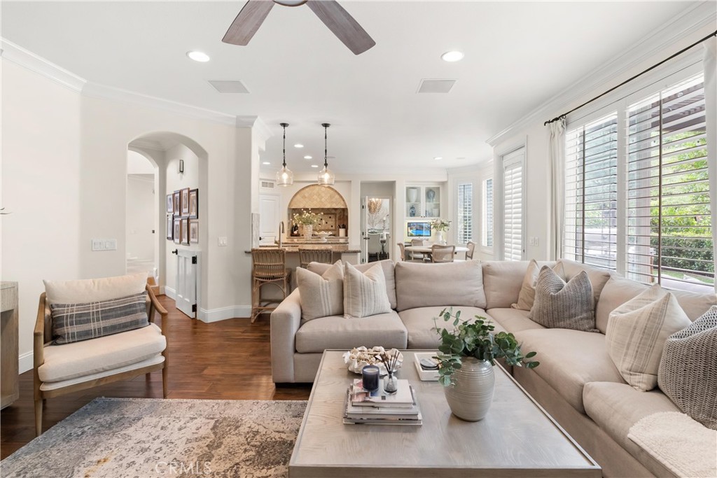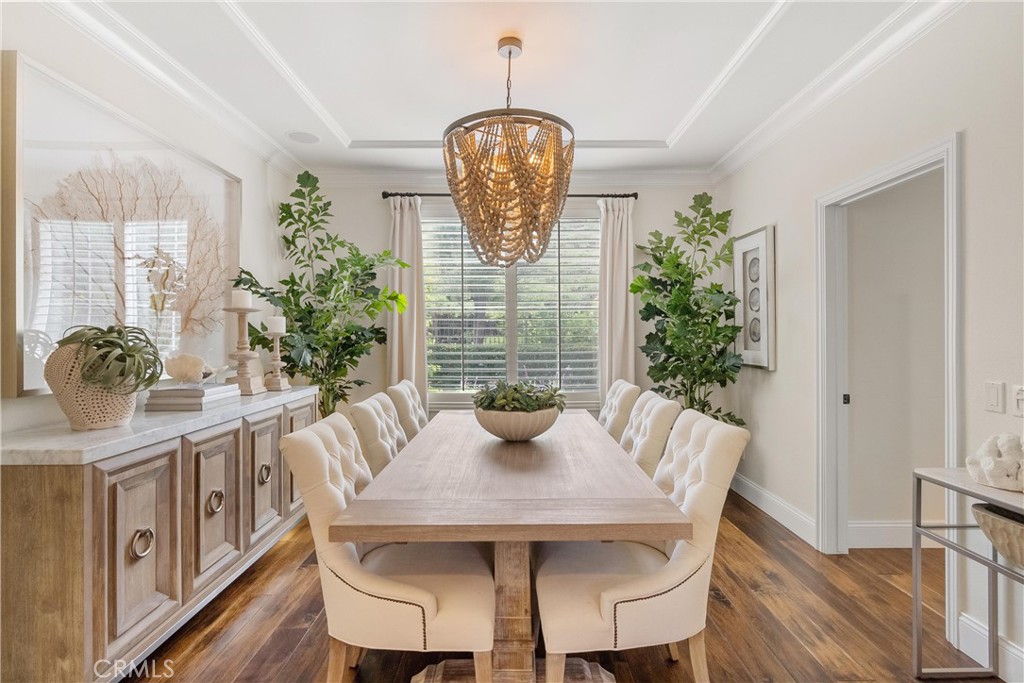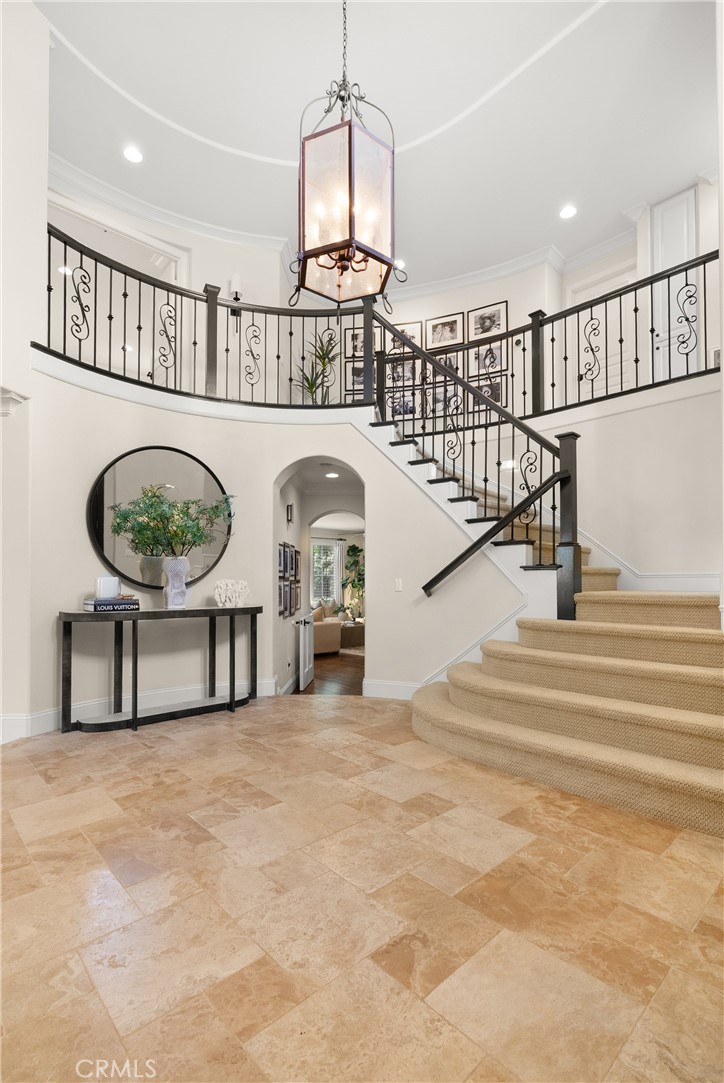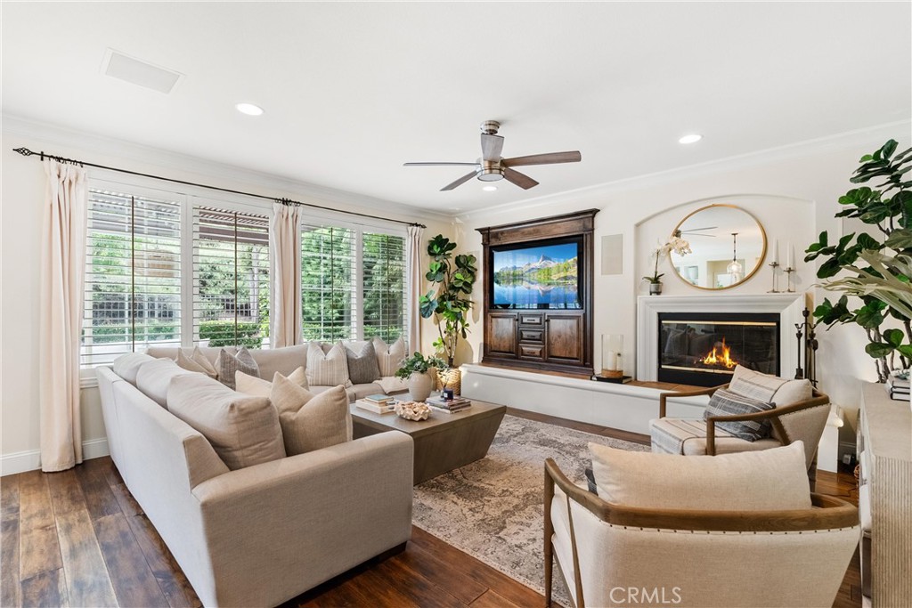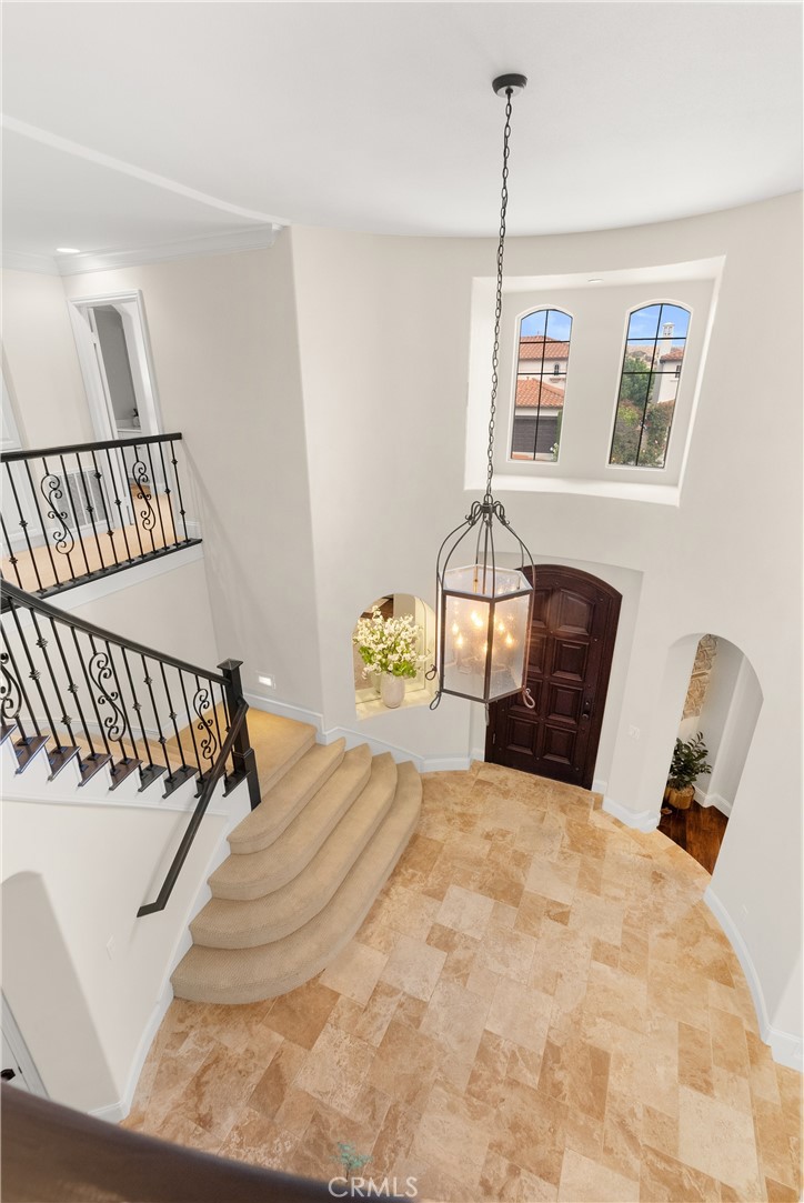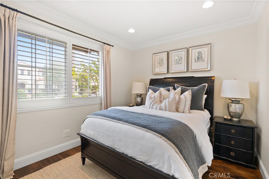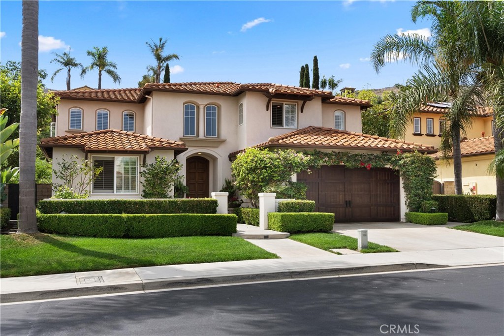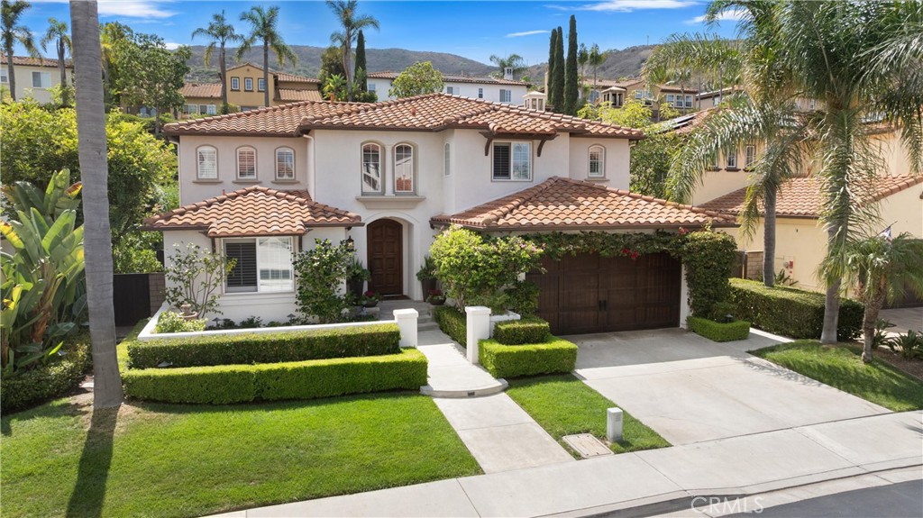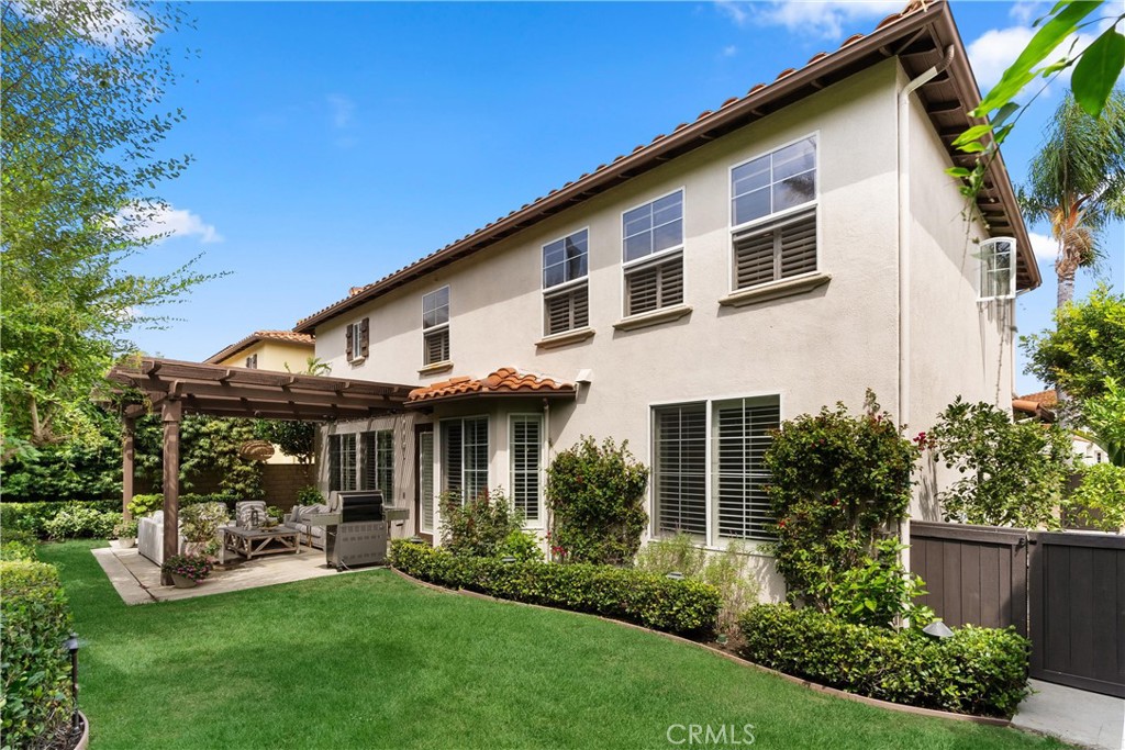 Nestled within a prestigious gated community, this elegant residence blends timeless upgrades with everyday comfort, offering a rare combination of sophistication and convenience. A charming courtyard entry with a fountain leads to a dramatic vaulted foyer with soaring ceilings, hardwood floors, and designer lighting accents that set the tone for the home's refined aesthetic.Formal living and dining rooms are enriched with crown molding, plantation shutters, and custom built-ins, while the gourmet kitchen boasts granite counters, a center island, and brand-new stainless appliances. The open-concept design flows seamlessly into the family room, highlighted by recessed lighting, a built-in sound system, and views of the tranquil backyard. On the main level, a highly desirable bedroom and a versatile bonus room offer exceptional convenience and flexibility. A remodeled laundry room with custom cabinetry completes the first floor.Upstairs, a spacious loft and private primary retreat create a true sanctuary. Designer details continue throughout with multiple ceiling fans, a wrought-iron stair railing, and thoughtful built-ins. Notable upgrades include a new air conditioning system, whole-home water purification, epoxy-finished garage flooring, an upgraded garage door, custom gates, and a newly designed front entry door.The backyard is enhanced by beautifully landscaped grounds, featuring a covered patio and inviting spaces for both entertaining and relaxation. With no Mello-Roos and a prime location near beaches, dining, and equestrian trails, this residence offers an exceptional lifestyle opportunity in the heart of South Orange County.