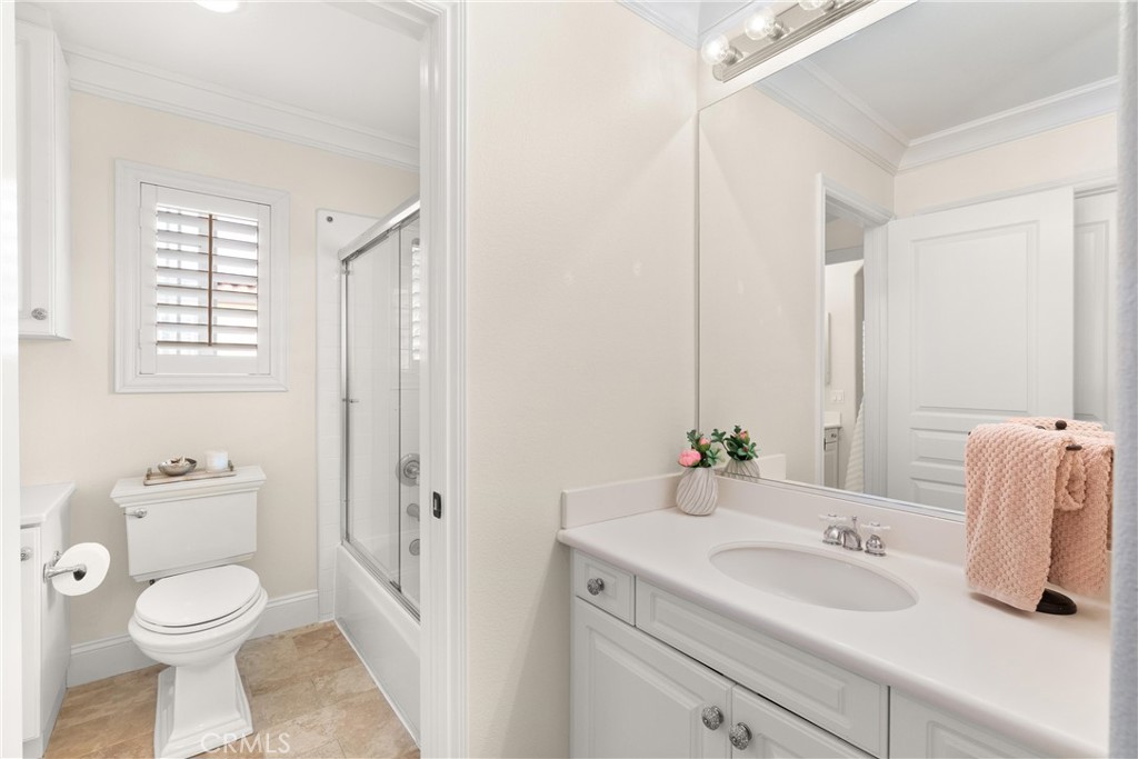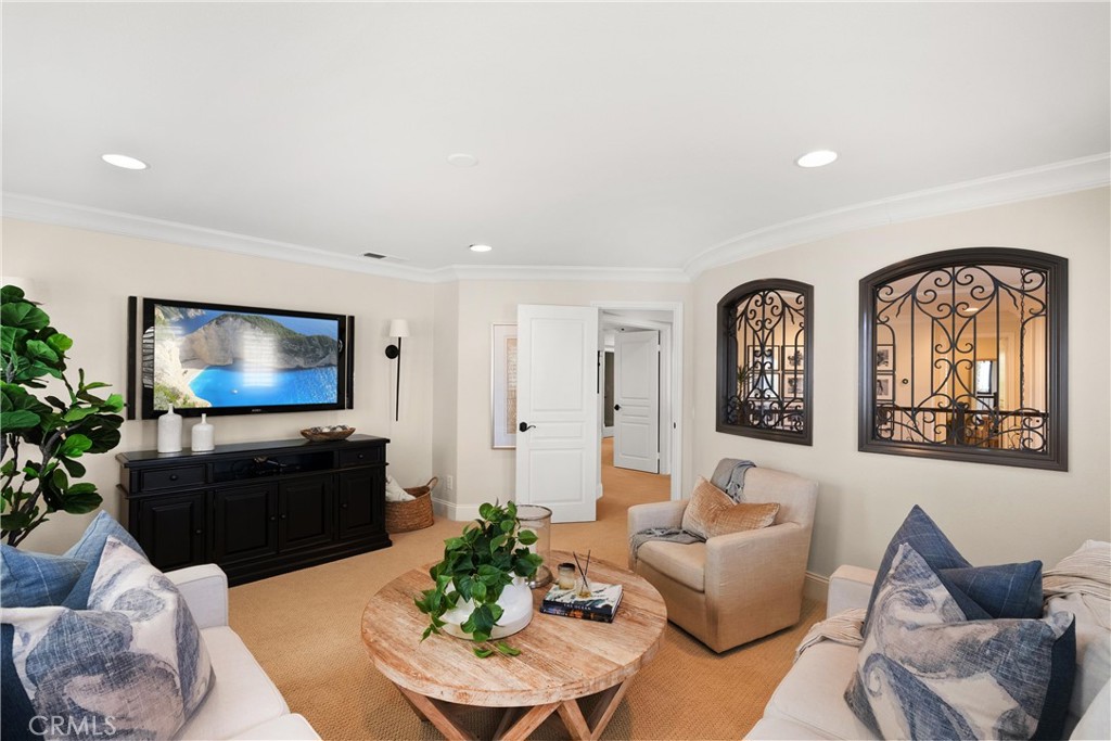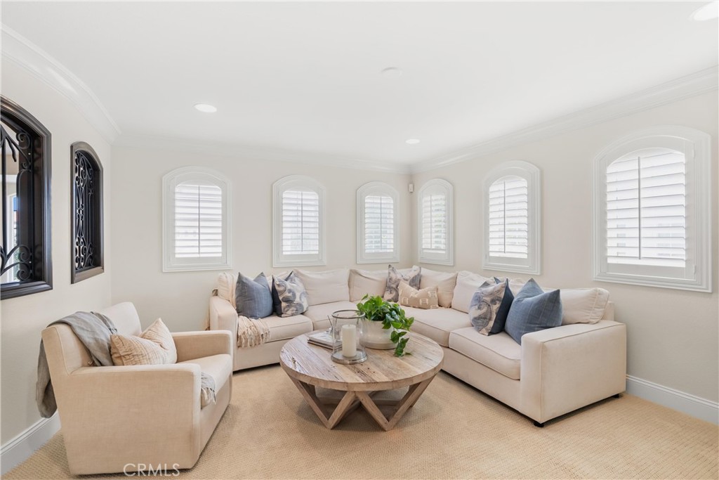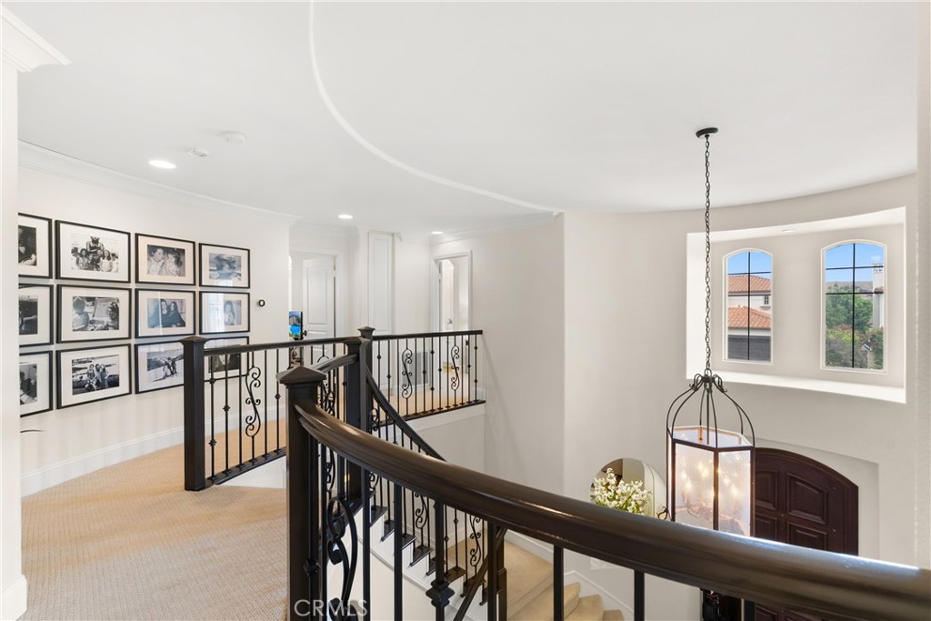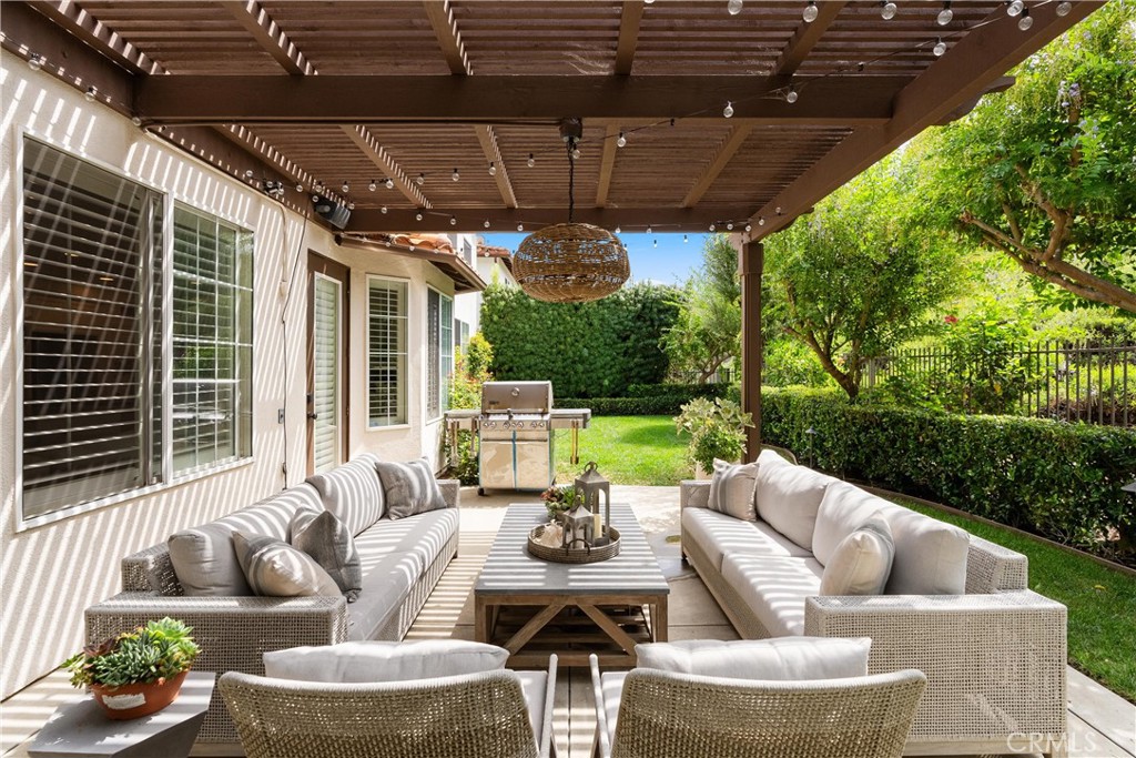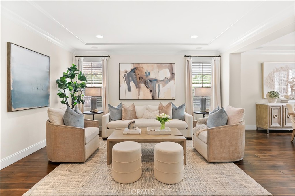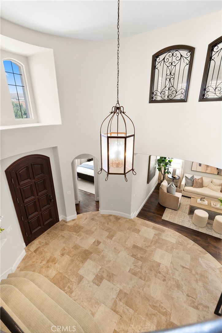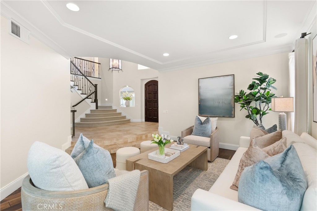 Nestled within a prestigious gated community, this elegant residence blends timeless upgrades with everyday comfort, offering a rare combination of sophistication and convenience. A charming courtyard entry with a fountain leads to a dramatic vaulted foyer with soaring ceilings, hardwood floors, and designer lighting accents that set the tone for the home's refined aesthetic.Formal living and dining rooms are enriched with crown molding, plantation shutters, and custom built-ins, while the gourmet kitchen boasts granite counters, a center island, and brand-new stainless appliances. The open-concept design flows seamlessly into the family room, highlighted by recessed lighting, a built-in sound system, and views of the tranquil backyard. On the main level, a highly desirable bedroom and a versatile bonus room offer exceptional convenience and flexibility. A remodeled laundry room with custom cabinetry completes the first floor.Upstairs, a spacious loft and private primary retreat create a true sanctuary. Designer details continue throughout with multiple ceiling fans, a wrought-iron stair railing, and thoughtful built-ins. Notable upgrades include a new air conditioning system, whole-home water purification, epoxy-finished garage flooring, an upgraded garage door, custom gates, and a newly designed front entry door.The backyard is enhanced by beautifully landscaped grounds, featuring a covered patio and inviting spaces for both entertaining and relaxation. With no Mello-Roos and a prime location near beaches, dining, and equestrian trails, this residence offers an exceptional lifestyle opportunity in the heart of South Orange County.