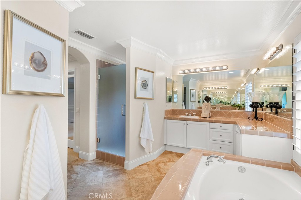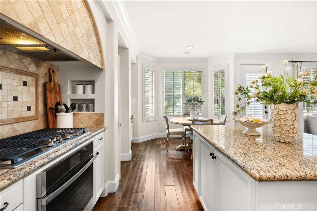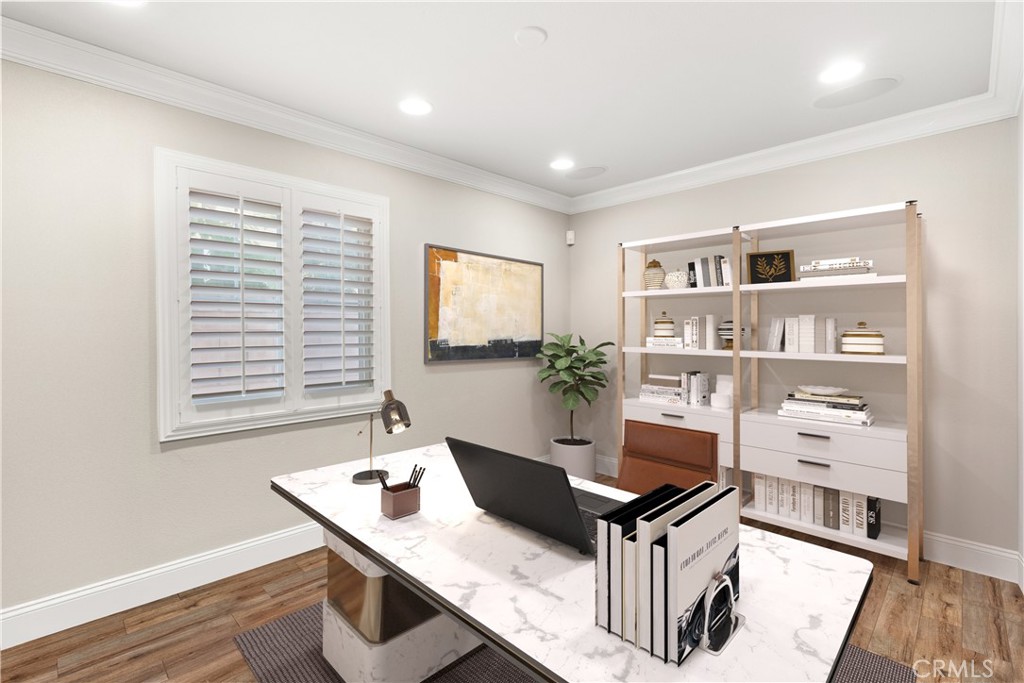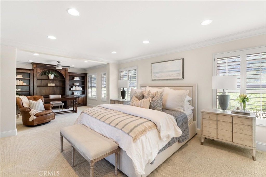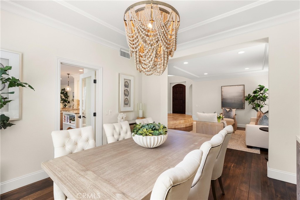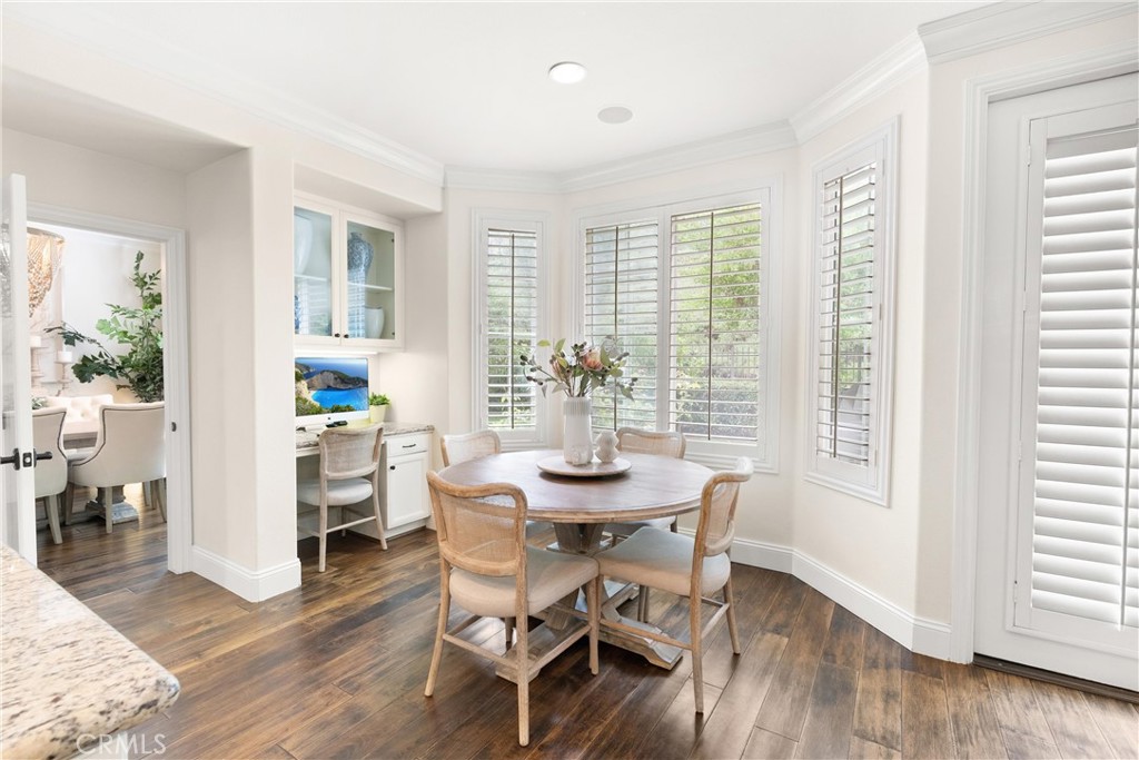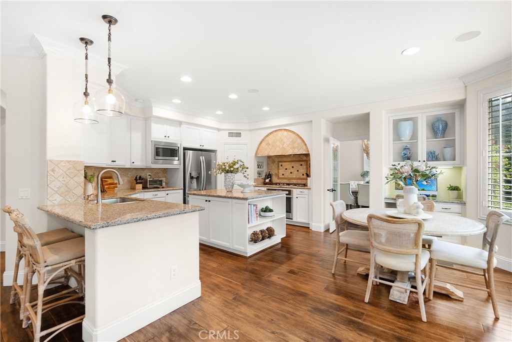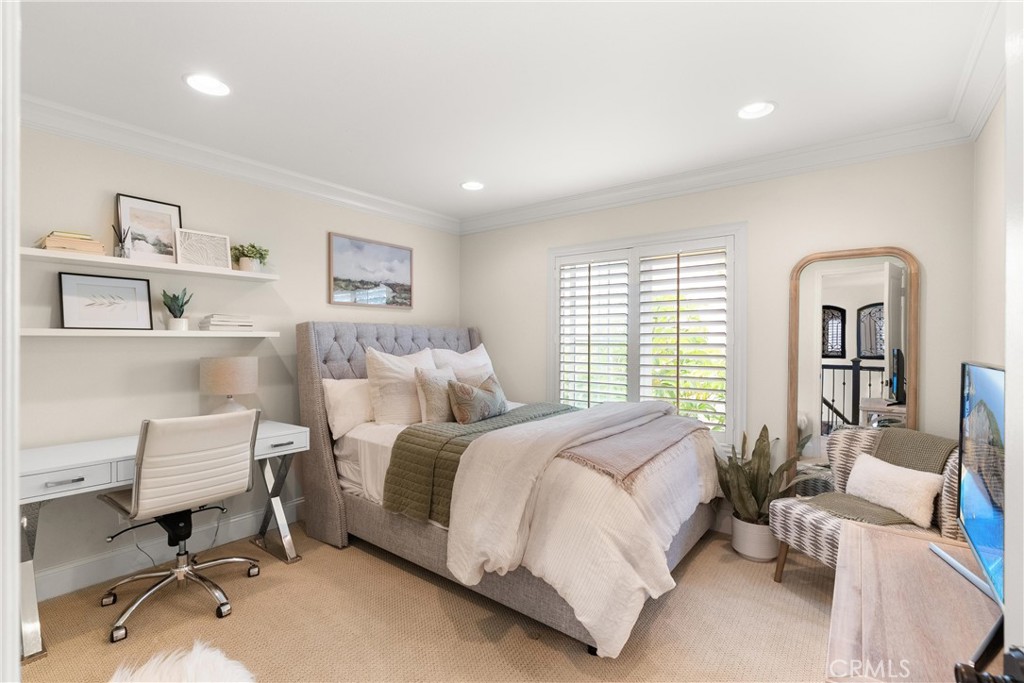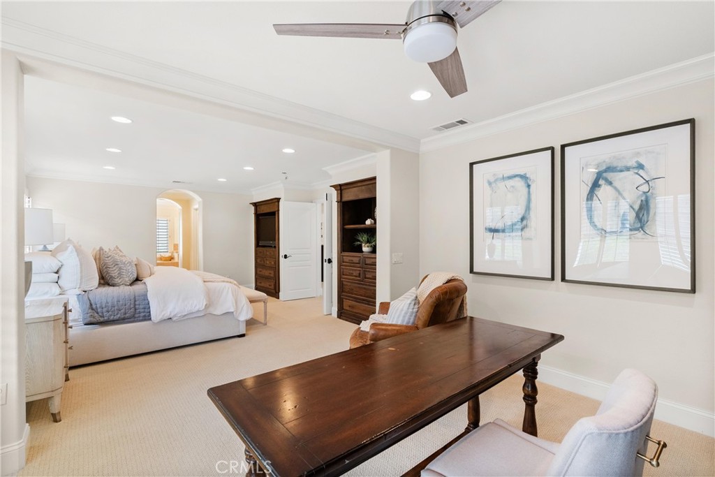 Nestled within a prestigious gated community, this elegant residence blends timeless upgrades with everyday comfort, offering a rare combination of sophistication and convenience. A charming courtyard entry with a fountain leads to a dramatic vaulted foyer with soaring ceilings, hardwood floors, and designer lighting accents that set the tone for the home's refined aesthetic.Formal living and dining rooms are enriched with crown molding, plantation shutters, and custom built-ins, while the gourmet kitchen boasts granite counters, a center island, and brand-new stainless appliances. The open-concept design flows seamlessly into the family room, highlighted by recessed lighting, a built-in sound system, and views of the tranquil backyard. On the main level, a highly desirable bedroom and a versatile bonus room offer exceptional convenience and flexibility. A remodeled laundry room with custom cabinetry completes the first floor.Upstairs, a spacious loft and private primary retreat create a true sanctuary. Designer details continue throughout with multiple ceiling fans, a wrought-iron stair railing, and thoughtful built-ins. Notable upgrades include a new air conditioning system, whole-home water purification, epoxy-finished garage flooring, an upgraded garage door, custom gates, and a newly designed front entry door.The backyard is enhanced by beautifully landscaped grounds, featuring a covered patio and inviting spaces for both entertaining and relaxation. With no Mello-Roos and a prime location near beaches, dining, and equestrian trails, this residence offers an exceptional lifestyle opportunity in the heart of South Orange County.