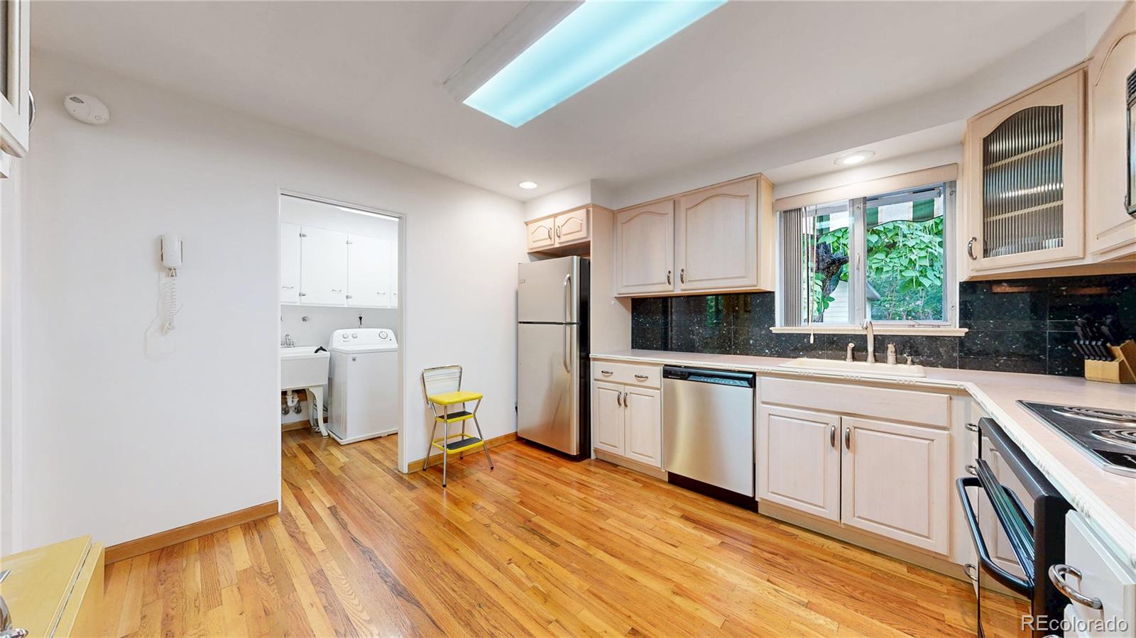 Welcome to this charming, well-cared-for home in Wheat Ridge. The main level features a family room and dining area that flow into the kitchen with warm hardwood floors. Three comfortable bedrooms, a full bathroom, and a laundry room complete the main floor. Step outside to enjoy the expansive backyard, designed for relaxation and entertaining with a spacious patio and storage shed. Parking and storage are a breeze with RV parking, an attached 1-car garage, plus a detached heated 3-car garage featuring storage shelves, a washer, utility sink, and its own 3/4 bathroom--perfect for hobbies or a workshop. Ideally located, this home offers easy access to Denver, DIA, and the mountains, while being close to Edgewater and Olde Town Arvada's local restaurants, breweries, and shops. Hurry, this charming property could be yours!