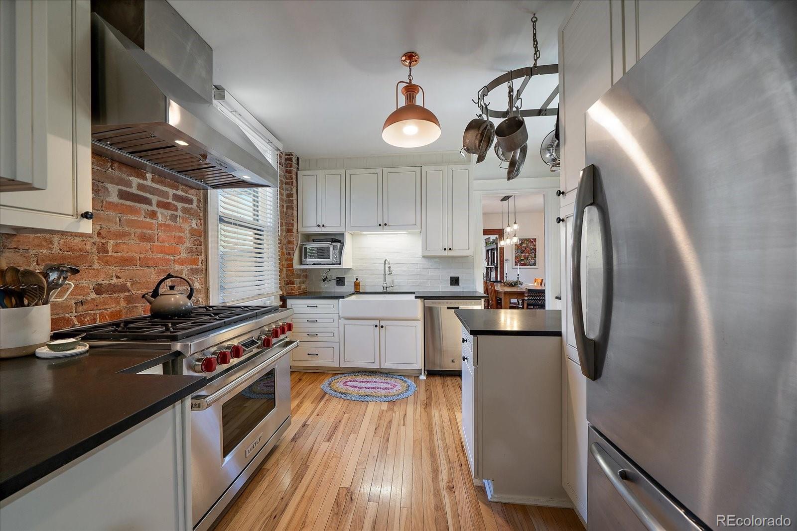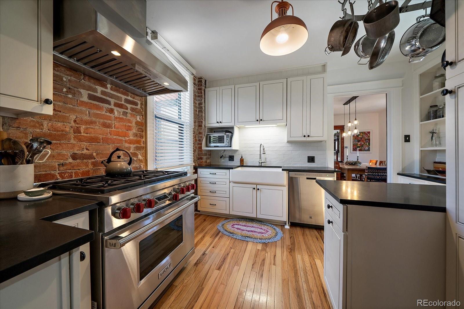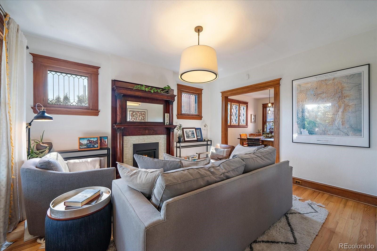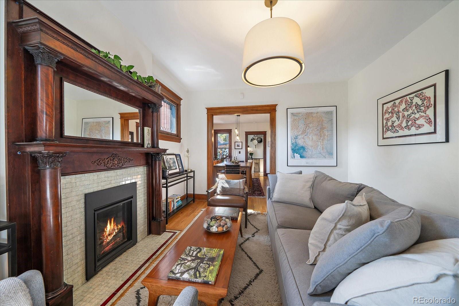 Elegant Two Story Brick Victorian with Finished Basement in Sought After Potter Highlands. Thoughtfully Remodeled While Preserving Character. Period Details Abound Featuring Tall Ceilings, Leaded Glass, Clawfoot Tub, Exposed Brick, Wainscoting, Hardwoods and Stain Grade Millwork. Kitchen Offers a Wolf Range, Farmhouse Sink, Sleek Counters, White Shaker Cabinetry and Exposed Brick. Tiled Gas Fireplace, Turn-of-the Century Mantel and Ample Seating in Living Room. Generously Sized Formal Dining with Traditional Woodwork. Mud Room with Bench Seating, Coat Hooks and Shelving. Office Space Provides a Built-In Desk, Bookshelves and Cabinets. Full Bath, Bedroom and Foyer Entry with Wooden Staircase Complete the Main Level. Primary Suite Boasting a Walk-In Closet and En Suite Bath. Bonus Room Off Primary Features a Vaulted Ceiling, Built-In Bookshelves, Private Deck and Voluminous Windows with Remote Controlled Shades. Versatile Space for Nursery, Secondary Office, Lounge, Exercise Room or Art Studio. Classic Tile, New Shower Glass Enclosure and Vanity in Primary Bath. Family Room, Bedroom with Legal Egress, Bath, Laundry and Storage in Renovated Basement. Beadboard Ceiling on Front Porch, Covered Rear Patio and Private Yard. Two Car Detached Garage with EV Charger Has Oversized Attic that Could be Converted into an ADU. Impressive Walk and Bike Scores to Myriad of Dining and Entertainment Options in Potter Highlands, LoHi, Sunnyside and 38th Corridor. Convenient Access to Highlands Square, Tennyson Street and Downtown.